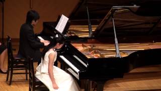第2楽章:ロマンス。変ロ長調、2/2拍子。三部形式。ピアノ主体のやさしい雰囲気に挟まれて、ト短調の中間部では突如として通り雨のような激しさが襲ってくる。