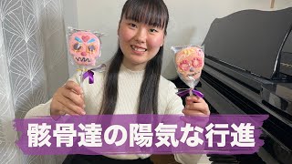 ラテン系のリズムが楽しい1曲です。8分休符を大切に、裏拍から次のモチーフが入ってくるリズム感を体で感じましょう。ピアノで演奏する前にリズム打ちをすることも有効だと思います。全体にスタッカートがついていますが、4分音符のスタッカートと8分音符のスタッカートのニュアンスの違いを意識しましょう。4分音符のスタッカートでは、弾いた後の余韻(響き)を聴くような感じで、点を打つような8分音符のスタッカートとの違いがあります。9小節目から強弱はfになり、右手が重音になります。さらに多くの骸骨たちが行進に参加したのでしょうか。左手は、しっかりとした音で重音を支えましょう。15